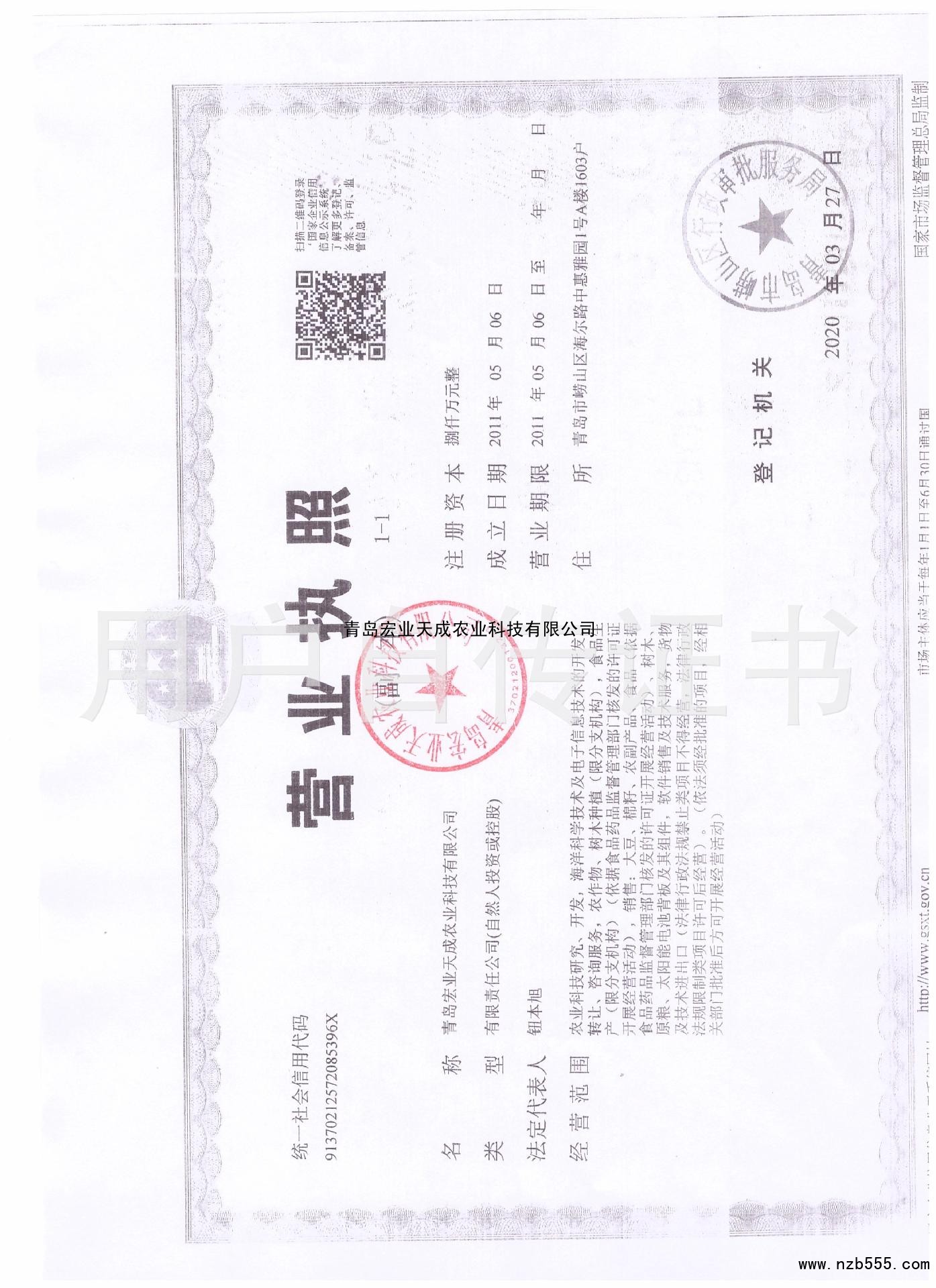 | 發(fā)證機(jī)構(gòu): | 青島市嶗山區(qū)行政審批服務(wù)局 | 發(fā)證時(shí)間 : | 2020-03-27 |