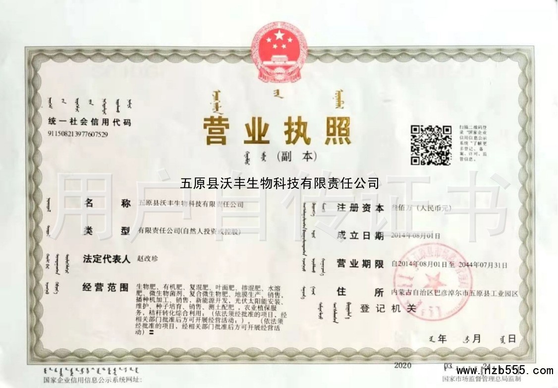 | 發(fā)證機(jī)構(gòu): | 五原縣市場(chǎng)監(jiān)督管理局 | 發(fā)證時(shí)間 : | 2020-03-24 |