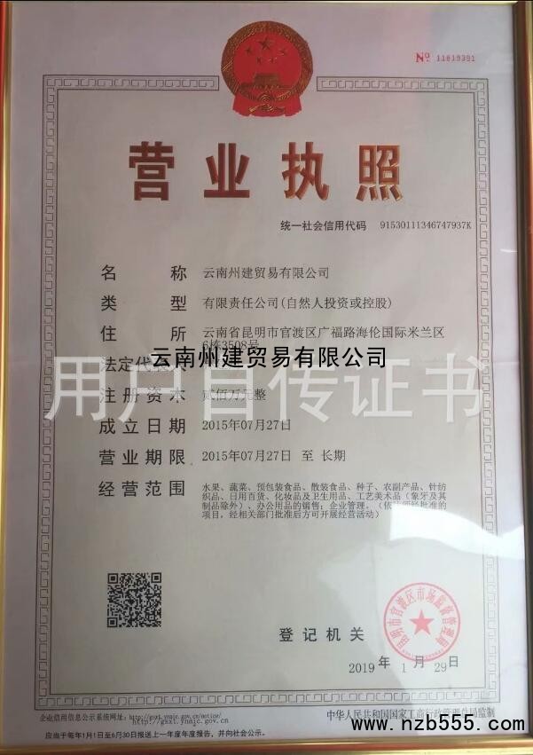 | 發(fā)證機(jī)構(gòu): | 昆明市官渡區(qū)市場(chǎng)監(jiān)督管理局 | 發(fā)證時(shí)間 : | 2019-01-29 |