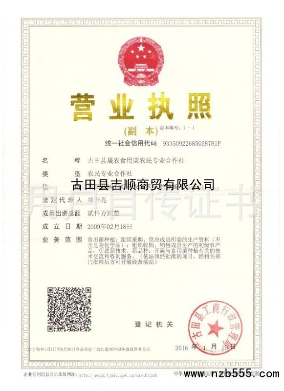 | 發(fā)證機(jī)構(gòu): | 古田縣工商行政管理局 | 發(fā)證時(shí)間 : | 2016-01-13 |