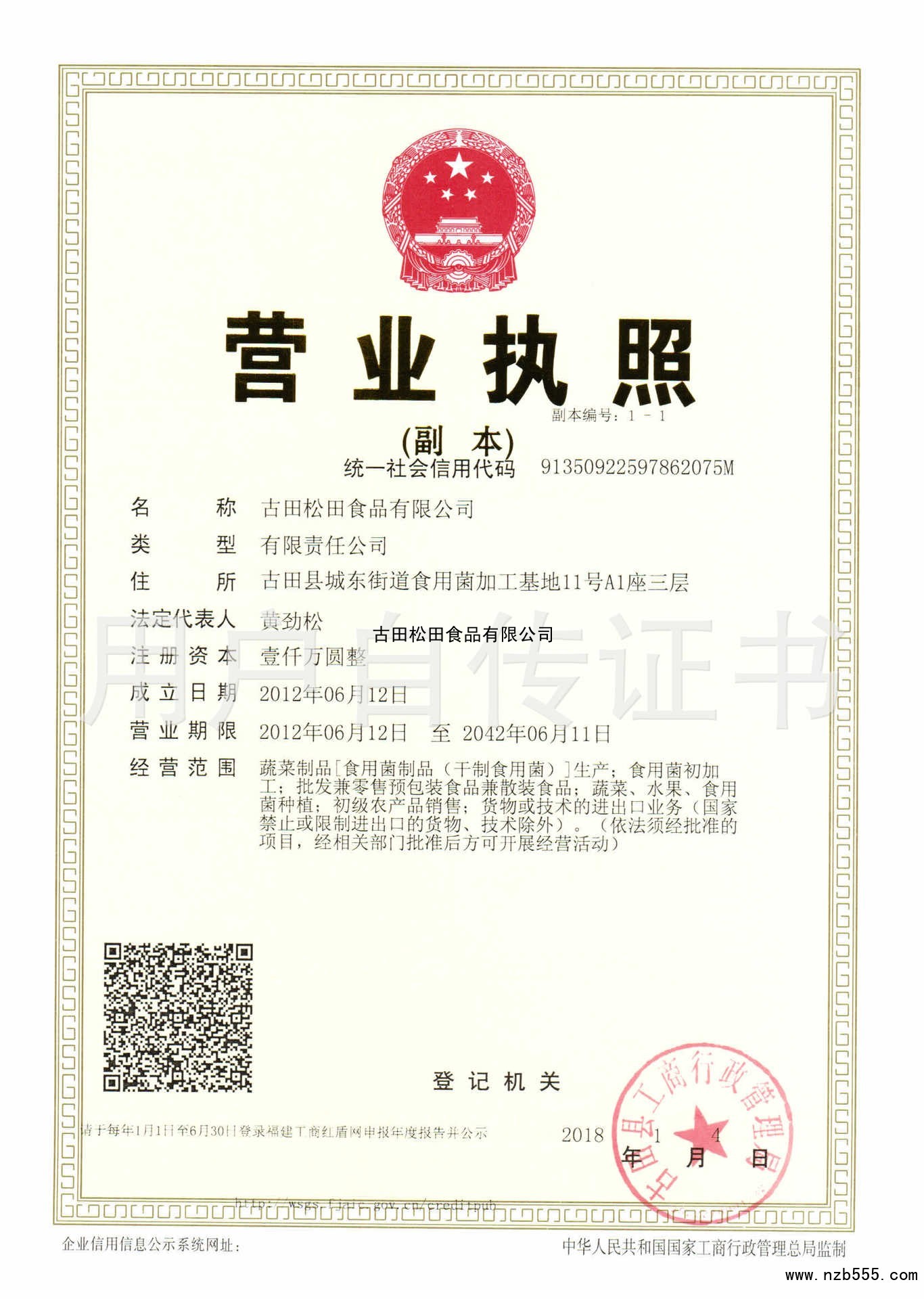 | 發(fā)證機(jī)構(gòu): | 古田縣工商行政管理局 | 發(fā)證時(shí)間 : | 2018-01-04 |