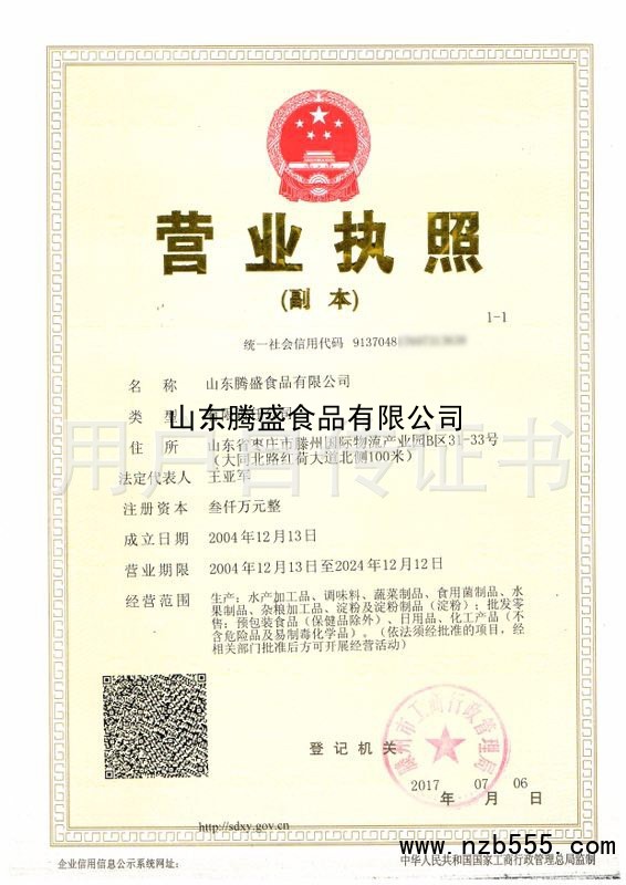| 發(fā)證機(jī)構(gòu): | 滕州市工商行政管理局 | 發(fā)證時(shí)間 : | 2017-07-06 |