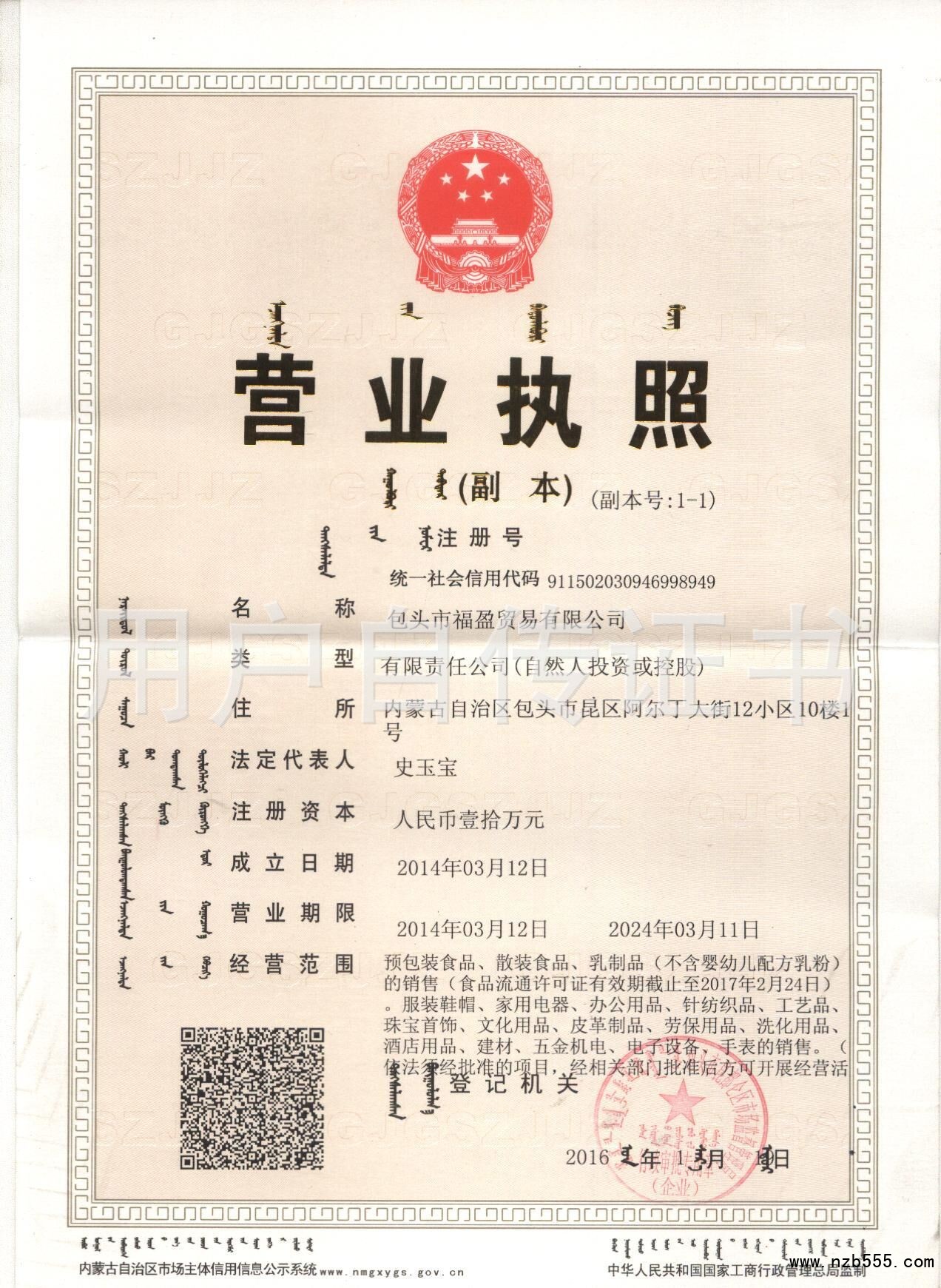 | 發(fā)證機(jī)構(gòu): | 包頭市昆都侖區(qū)市場監(jiān)督管理局 | 發(fā)證時間 : | 2016-01-19 |