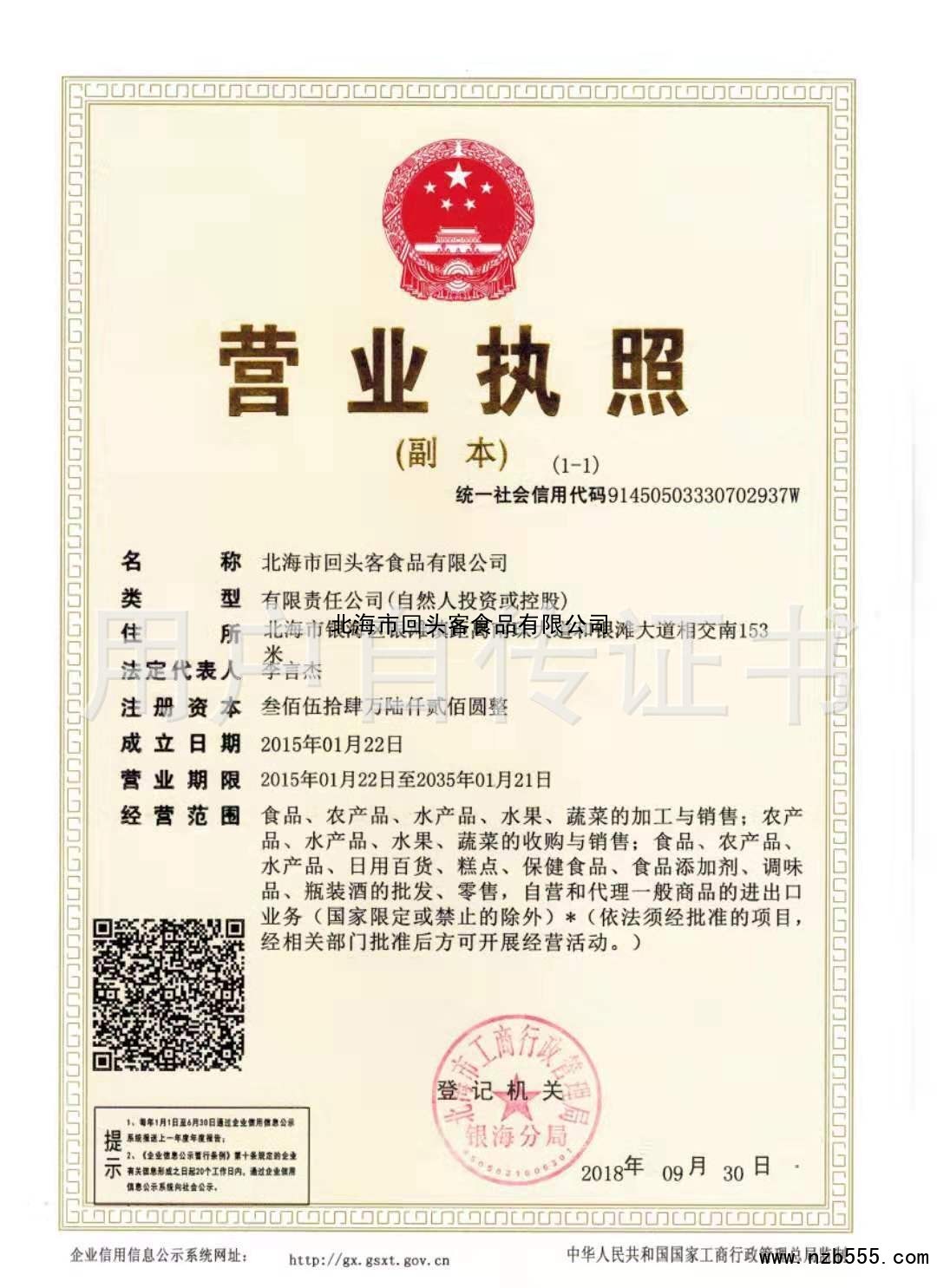 首頁 > 榮譽(yù)資質(zhì) > 北海市回頭客食品有限公司