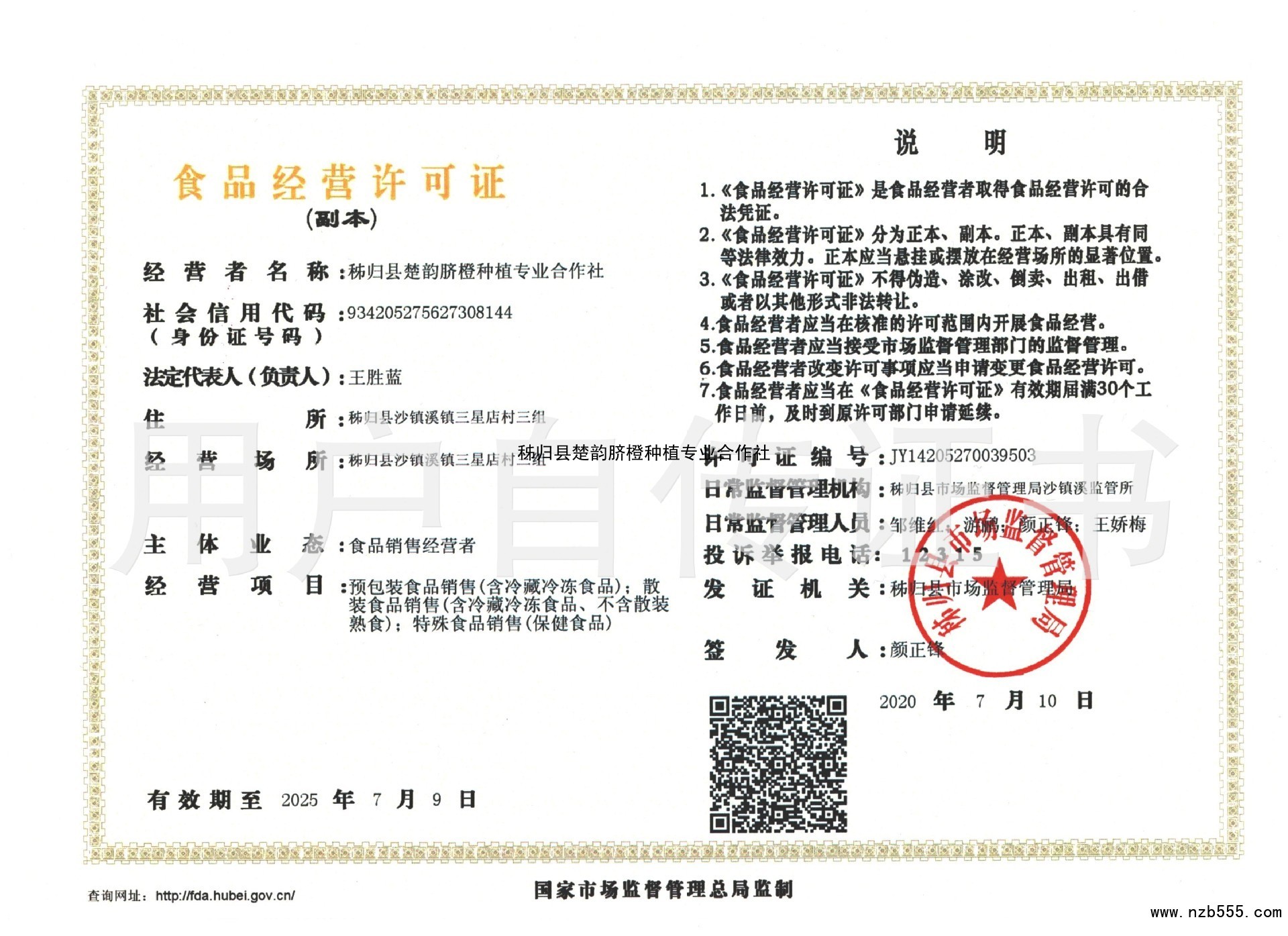 | 發(fā)證機(jī)構(gòu): | 秭歸縣市場監(jiān)督管理局 | 發(fā)證時(shí)間 : | 2020-07-10 |