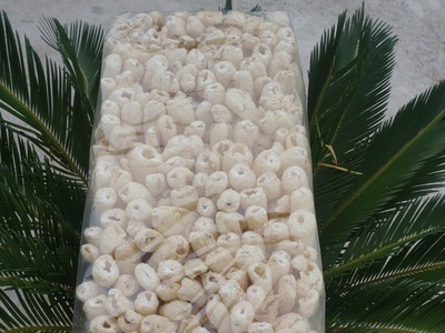 二、將干竹蓀50g用溫水泡10分鐘、洗凈,把切成很碎并加有鹽和味精的細豬肉放入竹蓀的空心中,一條條擺好,蒸25分鐘后,等50℃時切成方塊即可食用。