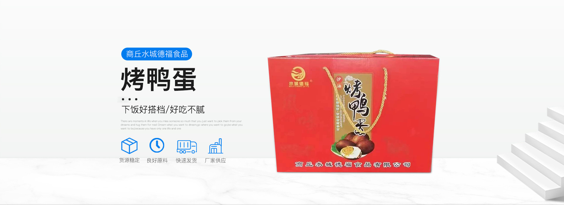 商丘水城德福食品有限公司成立于2016年,本公司是一個集收集,運輸,加工蛋制品為一體大型蛋鴨深加工公司,公司采取“公司+合作社+基地+農戶”的經營模式,其產品有泥淹紅油咸鴨蛋,泥淹茶香烤鴨蛋,蛋黃,松花蛋,生鮮蛋,草木灰生咸蛋等