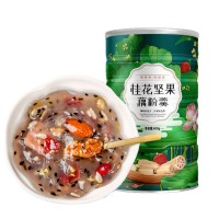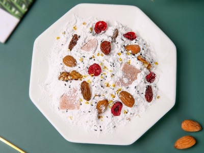 原料與配料藕粉 蔓越莓干 巴旦木 山楂 葡萄干 黑芝麻 葵花籽 核桃仁 提子干 冰糖 桂花