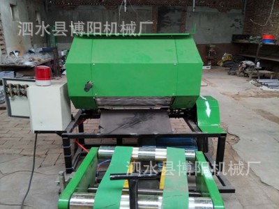 秸稈青貯工藝為,將秸稈揉碎,對揉碎的進行打捆,經包膜后進行貯存發酵,隨時調用。以上工序分別由揉搓機、打捆機、包膜機完成,包膜打捆一體機,集打捆機和包膜機一體機。目前市場上用于以上工序的三種設備都是獨立運行的,自動化程度低,使用時需人工轉移物料,加工效率低,人工成本高,且工人勞動強度大,不利于飼料青貯加工企業的規模性發展。