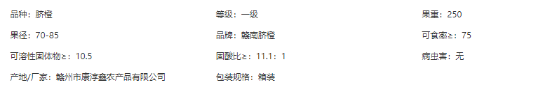 贛南臍橙果大形正,一般每個250克,橙紅鮮艷,光潔美觀,可食率達85%,顏色偏紅,比其他產地的橙子顏色略深;果皮光滑、細膩;果形以橢圓形多見。