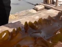海上的海帶養(yǎng)殖場(chǎng),原來(lái)海帶都是綁在繩子上的,漲知識(shí)了
